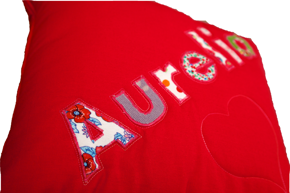 Aurelia’s Memory Cushion Posted on February 13, 2014 by Vicky This memory cushion was made using the pretty clothes that Aurelia wore during her first year. Her name was appliqued on the back using some of the same fabrics.