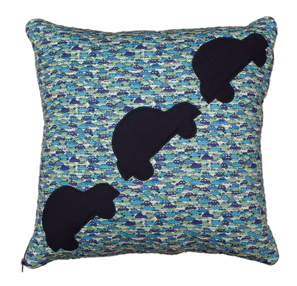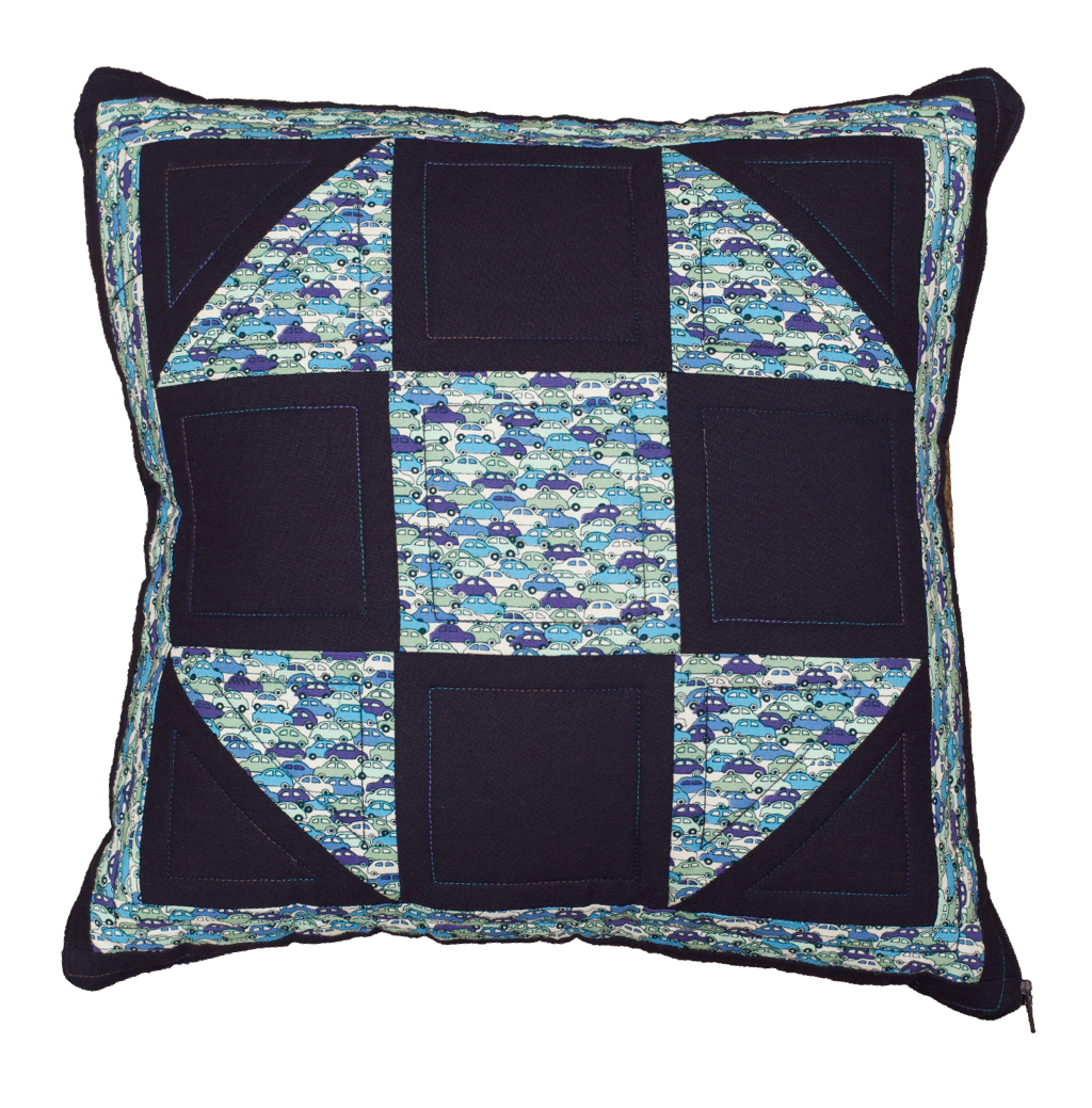 Car Cushion Posted on April 9, 2013 by Vicky This cushion was made using some fantastic fabric printed with hundreds of tiny cars. One side of the cushion is a patchwork design and the reverse has three applique cars driving up it!